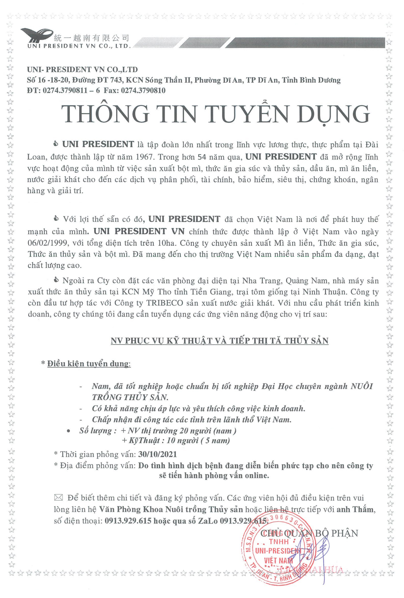 Công ty UP thông báo tuyển dụng nhân viên Phục vụ kỹ thuật và tiếp thị thức ăn Thủy sản