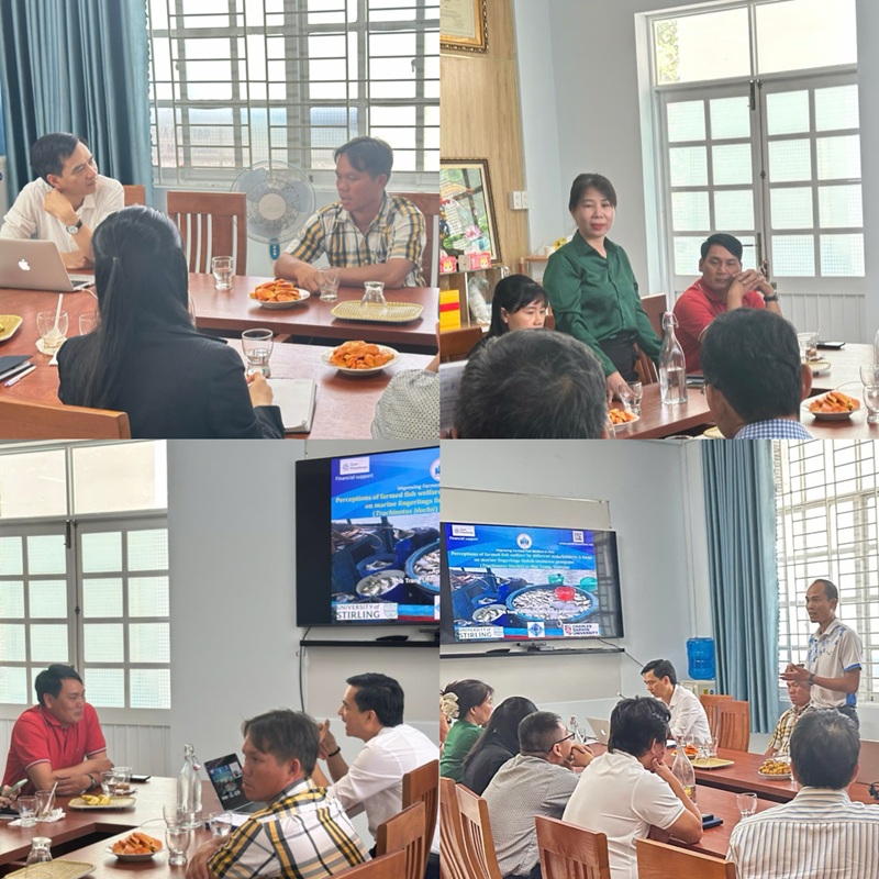 Trong khuôn khổ của dự án: Cải thiệu an sinh động vật ở Châu Á, nhóm nghiên cứu của Viện Nuôi trồng Thuỷ sản, Trường Đại học Nha Trang đã tổ chức thành công hội thảo công bố các kết quả đạt được của đề tài: “Nhận thức của các bên tham gia về an sinh cá nuôi: Trường hợp cá chim vây ngắn (Trachinotus spp.) giai đoạn giống ở Nha Trang, Việt Nam” trong buổi sáng ngày 18/4/2025 tại Phòng họp Viện NTTS.