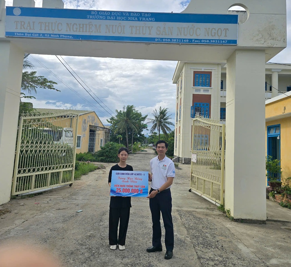 Ngày 01/6/2025, Viện Nuôi trồng Thủy sản – Trường Đại học Nha Trang đã tổ chức trao 01 suất học bổng khuyến học trị giá 25 triệu đồng cho sinh viên Ngô Thị Anh, lớp 64.NTTS-KS. Sinh viên Ngô Thị Anh là sinh viên năm thứ 3, ngành Nuôi trồng Thủy sản, có thành tích học tập khá và rèn luyện tốt. Hiện tại, hoàn cảnh gia đình của em rất khó khăn, do đó đã ảnh hưởng tinh thần và ý chí học tập của em. Suất học bổng này do các Cựu sinh viên lớp 42.NTTS-1 trao tặng, nhằm tiếp sức cho em Ngô Thị Anh vượt qua khó khăn, tiếp tục học tập tốt để hoàn thành ước mơ đại học của mình.